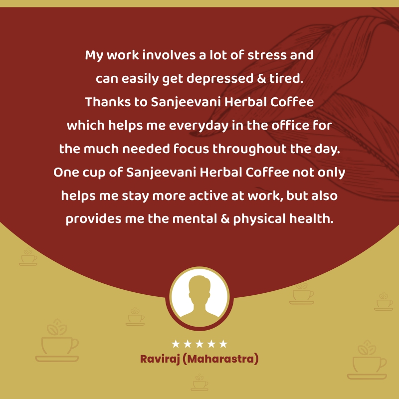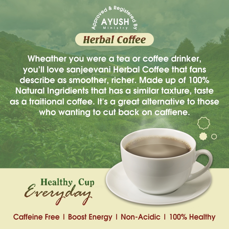 Sanjeevani Herbal-Coffee is an india’s first ministry of ayush approved & registered caffeine free herbal coffee. Made from the combination of goodness of herbs and plants. The component herbs are enriched in vitamins, it helps you to improve your hepatic and digestive balance, supports respiratory system. Herbal coffee boosts your immunity and keeps disease at bay. It nourishes and relax your body and mind.
