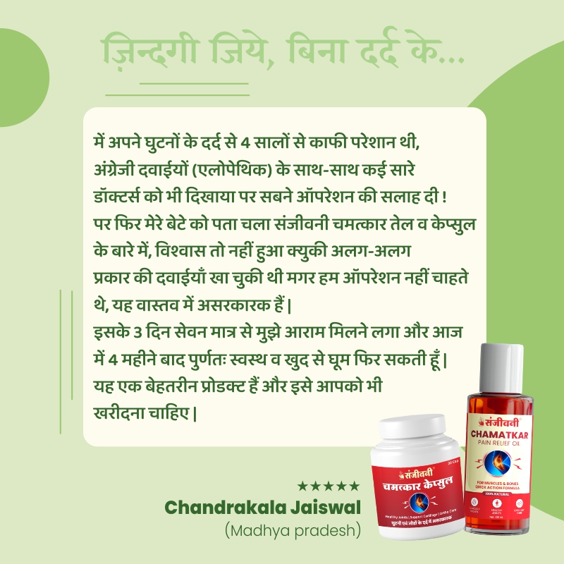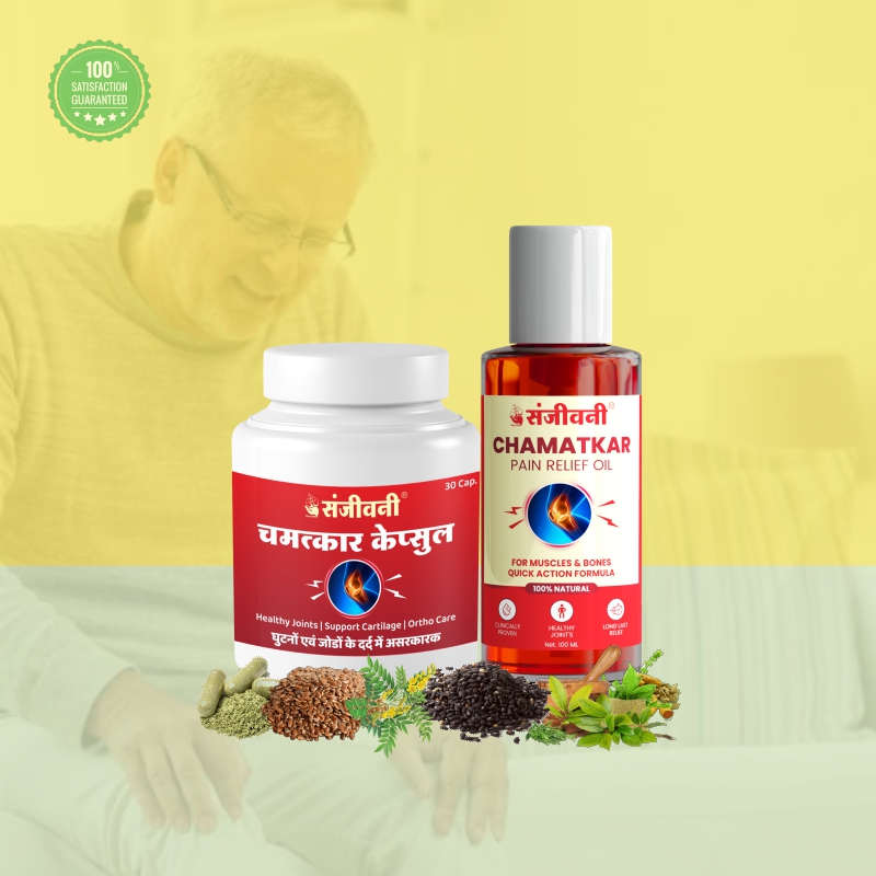 Sanjeevani Chamatkar Capsule is a natural ayurvedic formulated medicine for completely relieving the knee pain and it can also repair and restore your damage cartilage, using this capsule you can move freely and pain free. No need of any knee surgery. And for rapid relief also use our sanjeevani chamatkar Pain Relief Oil.