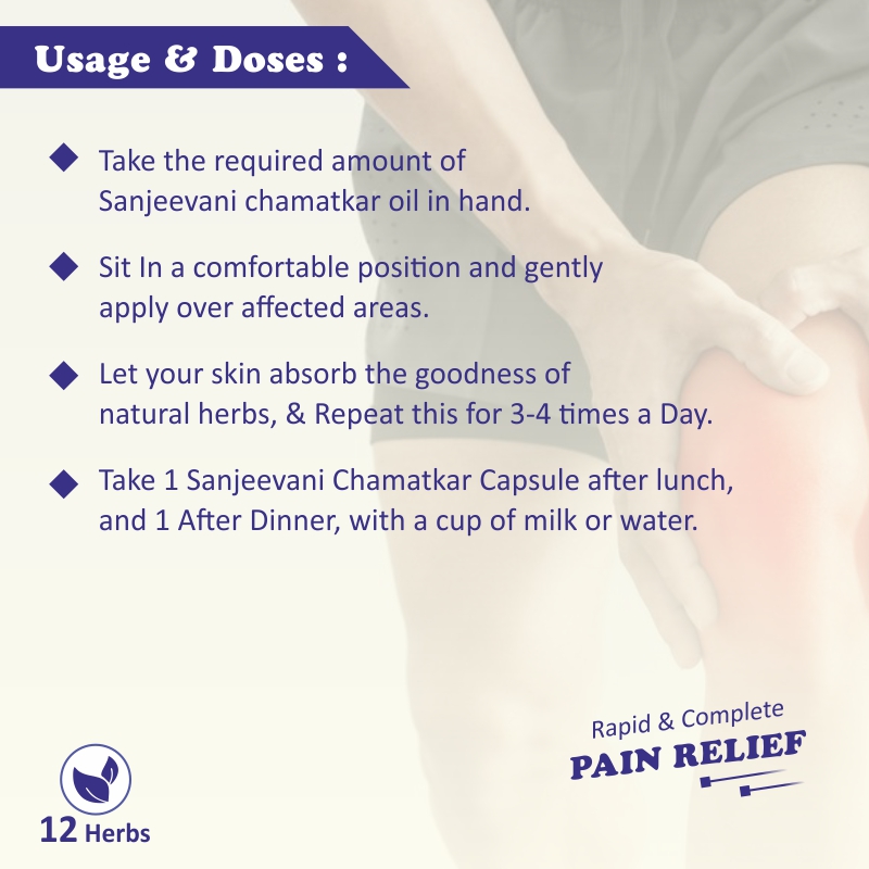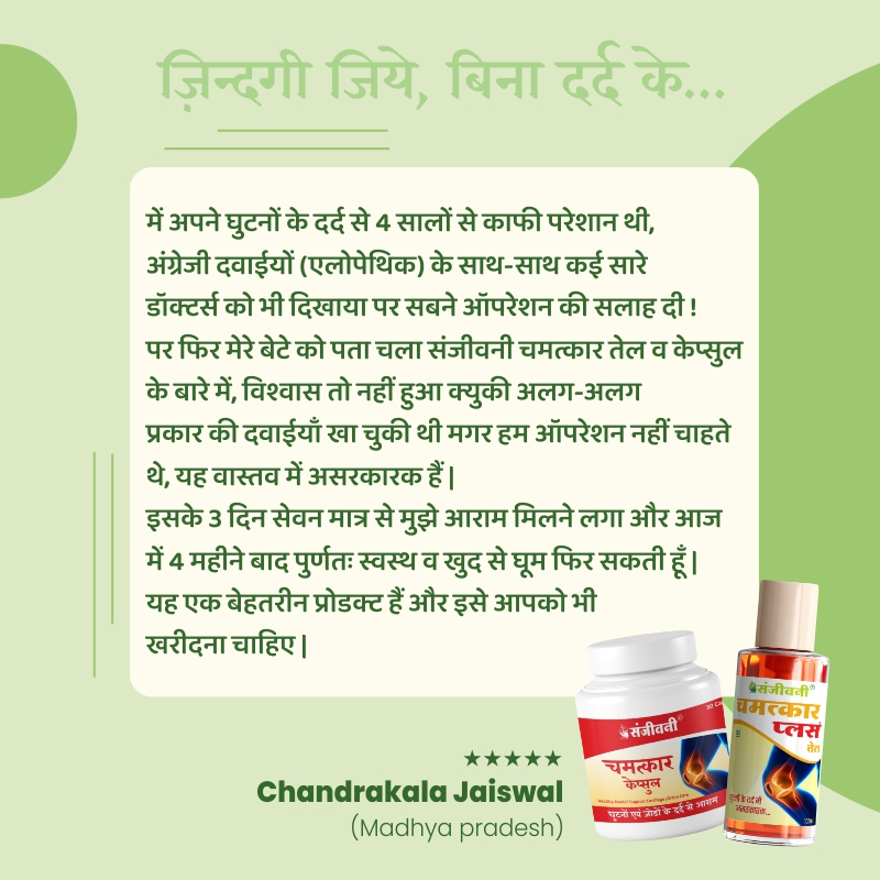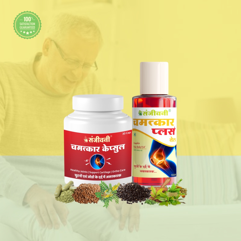 Sanjeevani Chamatkar Capsule is a natural ayurvedic formulated medicine for completely relieving the knee pain and it can also repair and restore your damage cartilage, using this capsule you can move freely and pain free. No need of any knee surgery. And for fast results also use our sanjeevani chamatkar Plus Oil.