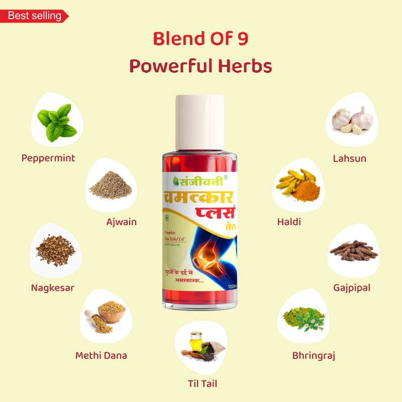 Sanjeevani Chamatkar Plus Oil is very effective in relieving the joint pains like back-pain, knee-pain, slip-disc & all other kinds of pains. Muscles gain more strength and power, if the joints are gently massaged with this oil. The process of bone formation is well-balanced hence chamatkar Oil is highly beneficial in arthritis, osteoporosis, rheumatoid.