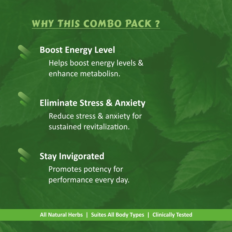 Elevate your male health and well-being with our Powerful combo pack, Our formula is a harmonious blend of natural herbs and time-tested traditional ingredients. We understand the importance of holistic well-being. Our formulation goes beyond specific functions, promoting overall male health, balance, and longevity.